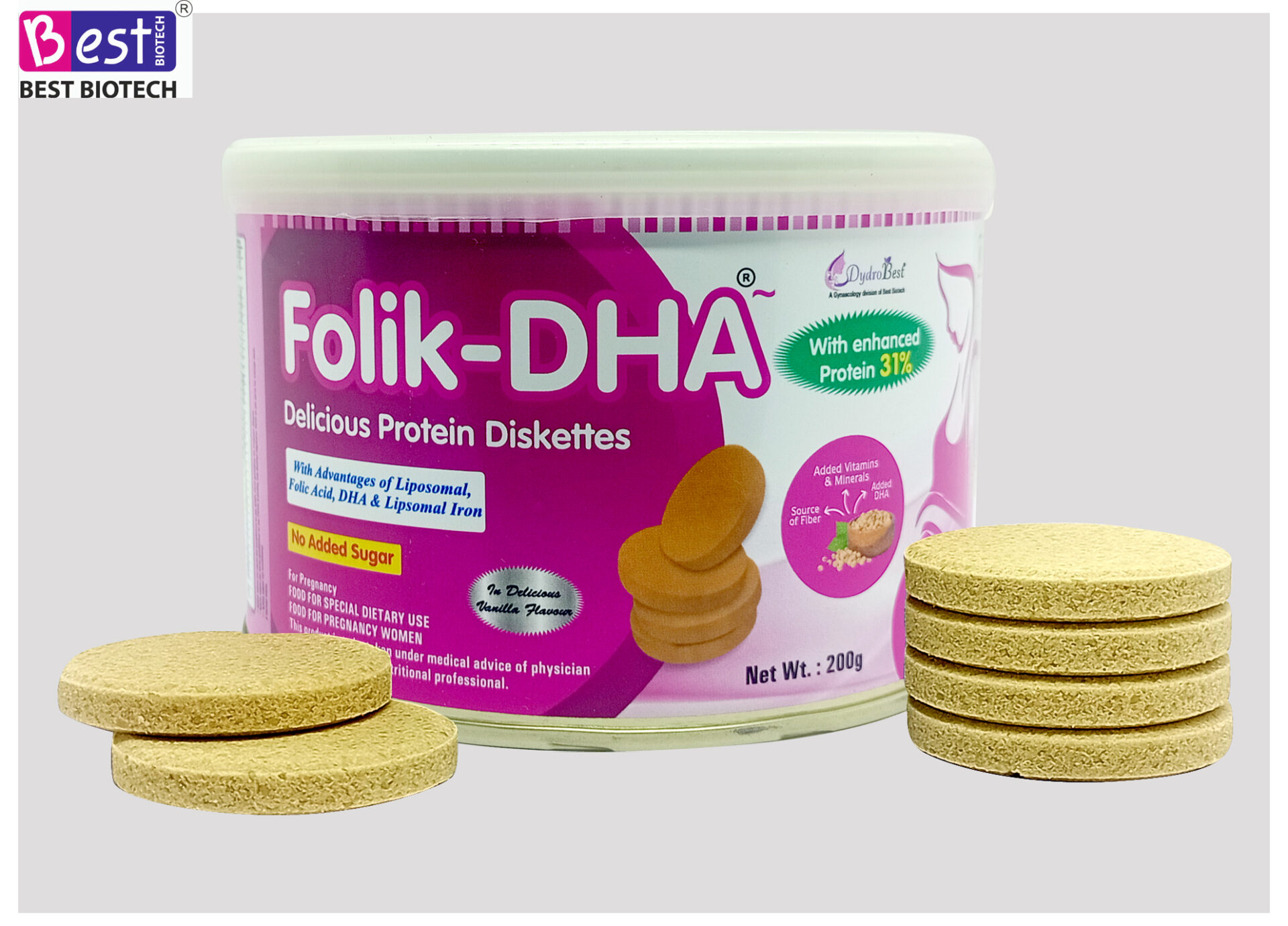 | Composition | 31% Protein+Liposomal Iron+Liposomal Folik acid+DHA (Veg) with vitamins& Minerals |