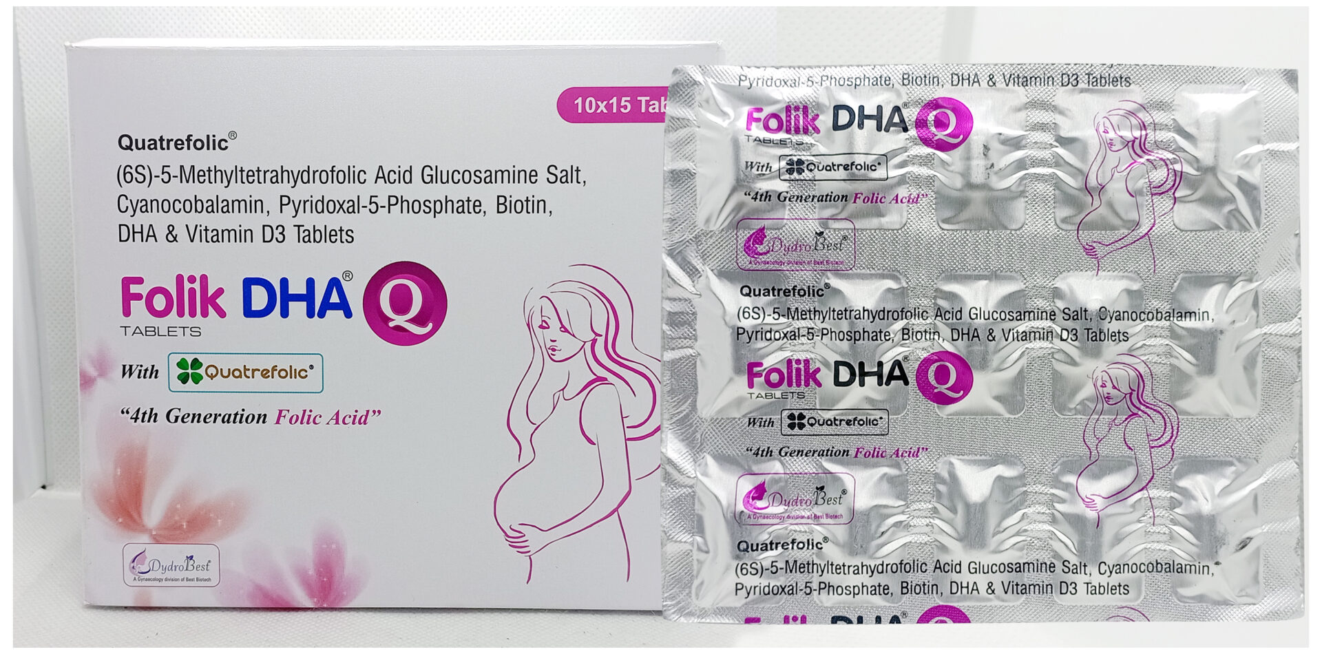 | Composition | Quatrefolic (6S)-5-Methyltetrahydrofolic acid glucosamine salt+DHA 250mg(veg source), Vit B12 2.2 mcg + Pyridoxal 5 phosphate 1.9 mg + Vit D3 600 I.U + D-Biotin 30mcg tablets |
